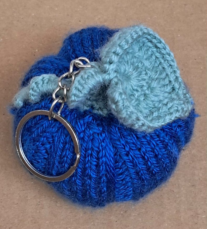 Renkli mavi tonlarda, örgü dokusu ve yumuşak yapısıyla rahat bir kadın anahtarlığı.