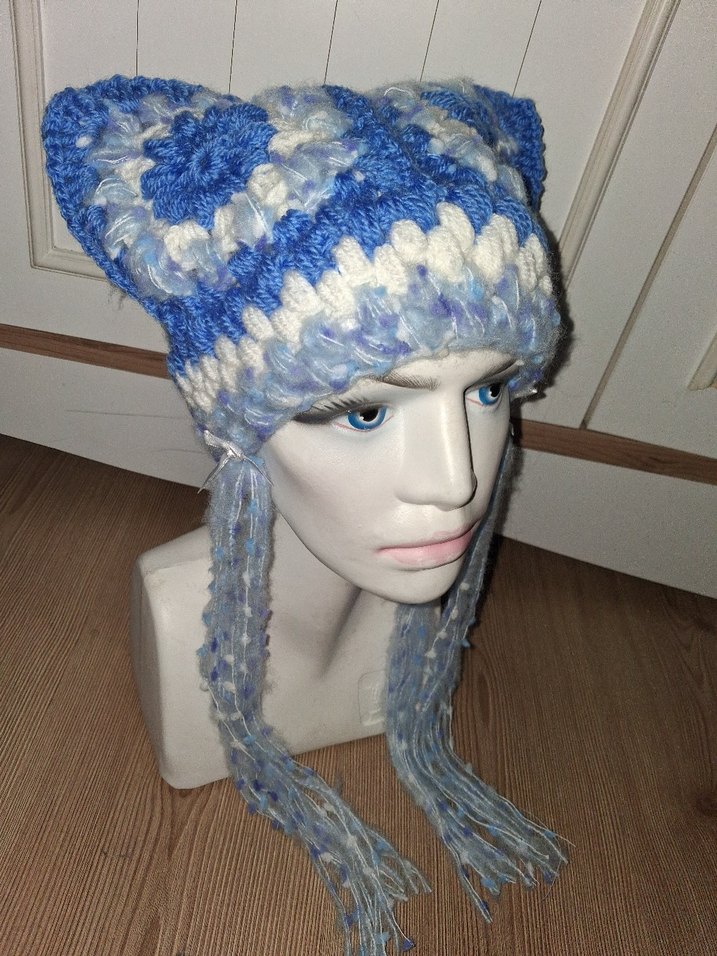 Uzun püsküllü, hafif mavi örgü kadın bere. Rahat, bohem tarzda, yumuşak örgü kumaştan yapılmıştır. Retro ve karşı kültür havası verir.