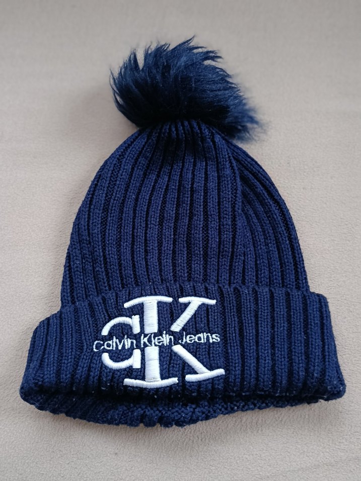 Mavi örgü kadın bere, yumuşak fleece astarlı ve üstünde tüylü ponponlu. Manşetinde Calvin Klein logosu işlenmiş, trend sokak stili için uygun.