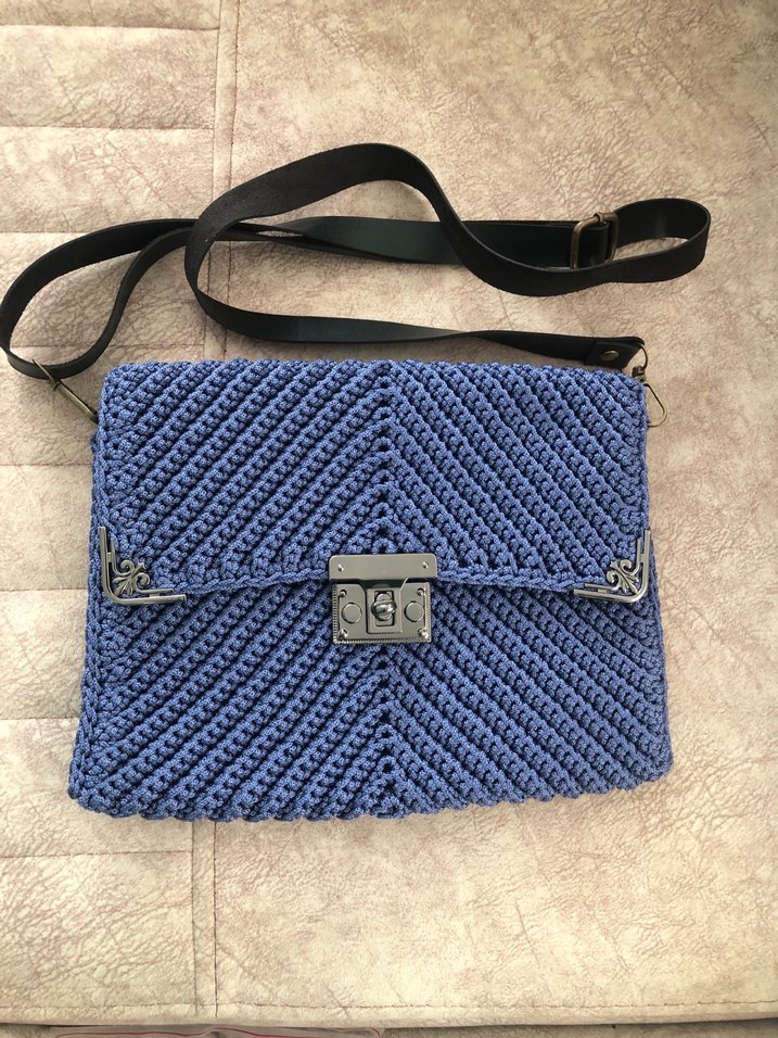 Ayarlanabilir siyah askılı, metal kilitli mavi örgü kadın çantası, rahat bohem tarzda. Polyester makroma ile örüldü