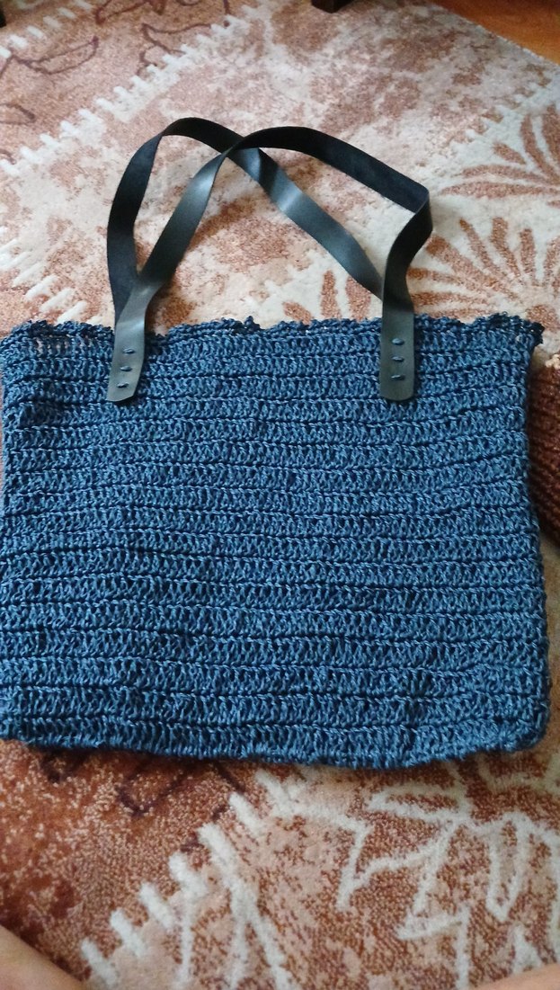 Kadınlar için örme mavi çanta, siyah saplarıyla rahat ve sade bohem tarz sunar, günlük kullanıma uygundur.