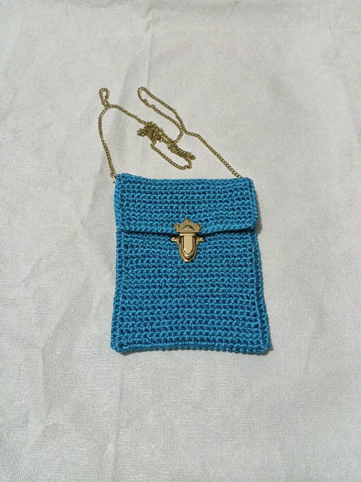 Mavi örgü kadın çanta, renkli ve bohem tarzda, altın zincir ve tokalı. Desensiz örgü tasarımı günlük kullanıma uygundur.