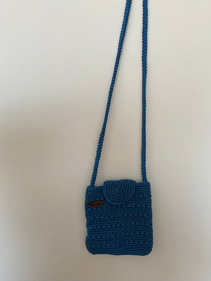 Mavi renkli, örgü kumaştan yapılmış kadın çapraz çanta. Minimalist bohem tarzıyla sade ve günlük kullanıma uygun. El emeği makrome örme telefon cüzdan çantası . Hiç kullanılmadı , kendim ördüm .