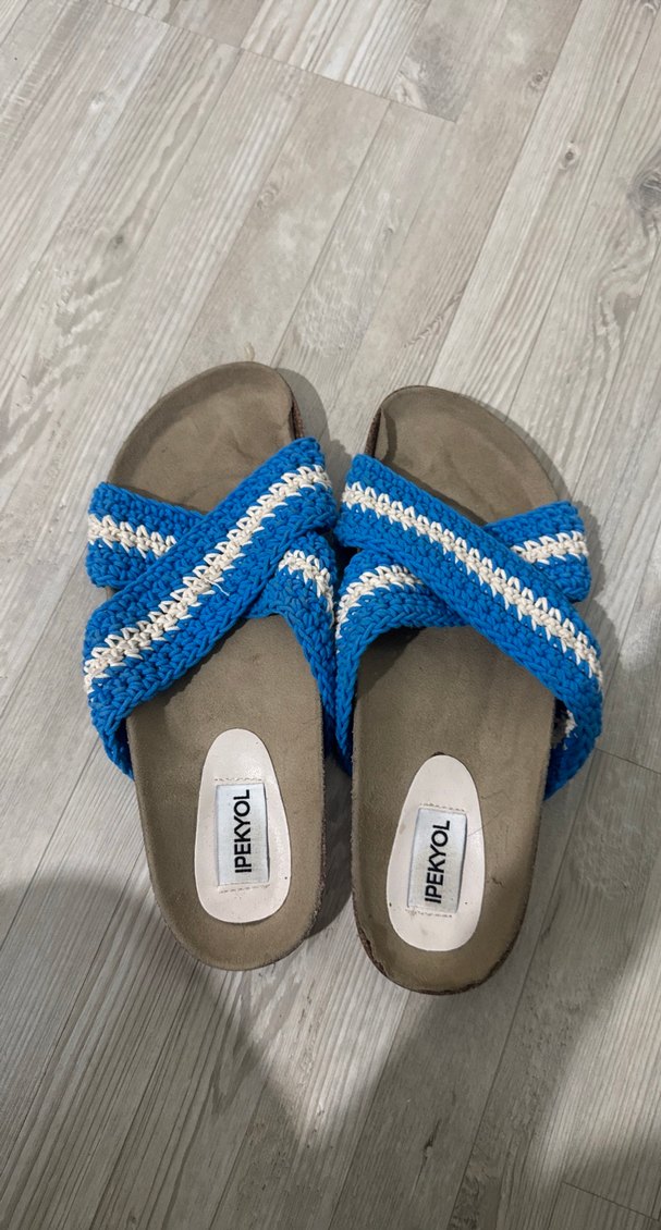 Mavi örgü dolgu topuk terlik, günlük kullanıma uygun rahat ve şık, bohem tarzına uyumlu.
