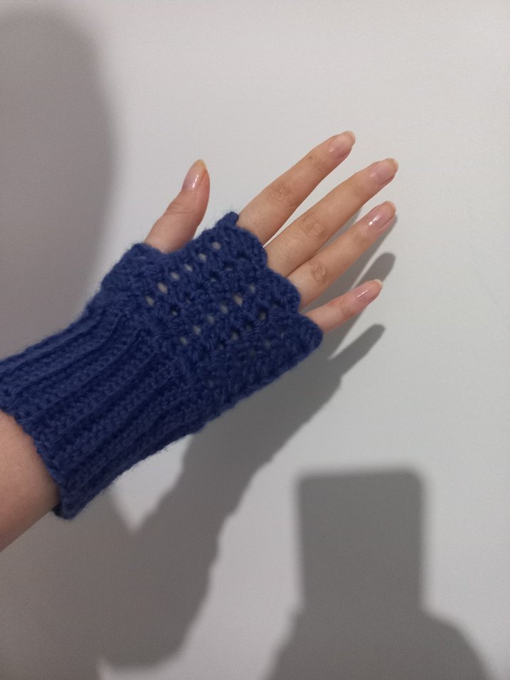 Bu koyu mavi örgü kadın eldiveni, sade ve gotik bir tarz sunar. Parmaksız ve yumuşak örgü kumaştan yapılmıştır.