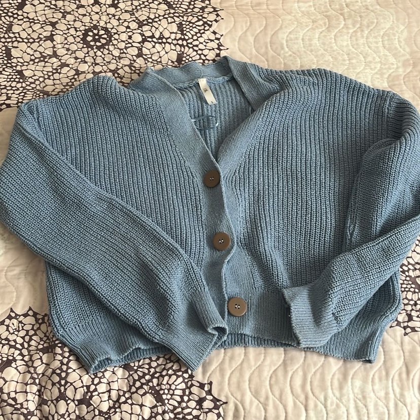 Bu örgü kadın hırka, bol kesim, uzun kollu ve yuvarlak yakalıdır. kisadir boyu biraz crop seklinde az giyildi