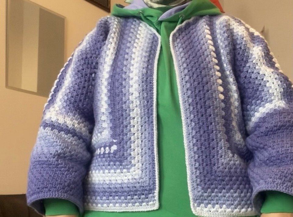 Uzun kollu, mavi örgü kadın hırka, salaş ve normal boyda. Düz renk ve tekne yakalı, rahat ve bohem tarzda günlük kullanıma uygun.