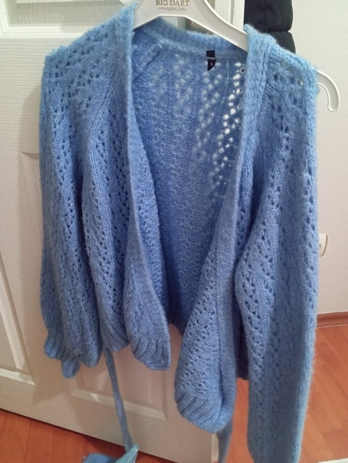 Pastel mavi renkli, uzun kollu ve yuvarlak yaka, bol kesim örgü kadın hırka, rahat ve bohem tarzda, günlük kullanım için uygundur.