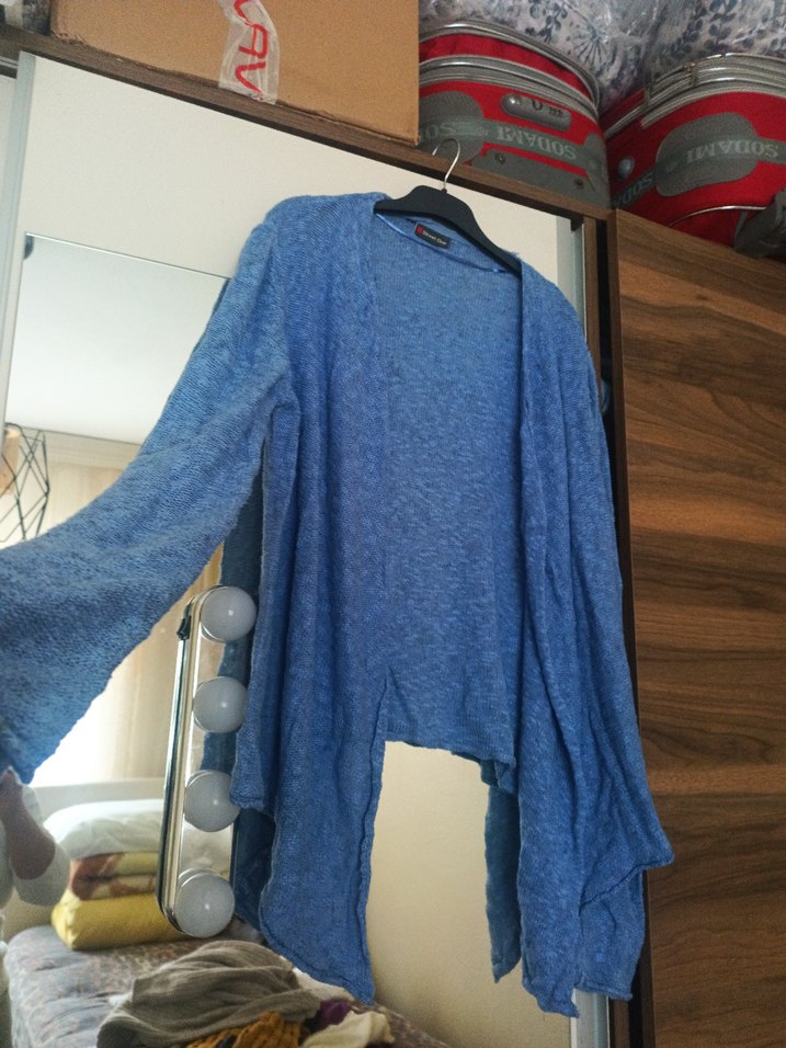 Mavi renkli, örgü yapıda, bol kesim uzun kollu kadın hırka rahat ve bohem tarzda günlük kullanıma uygun.