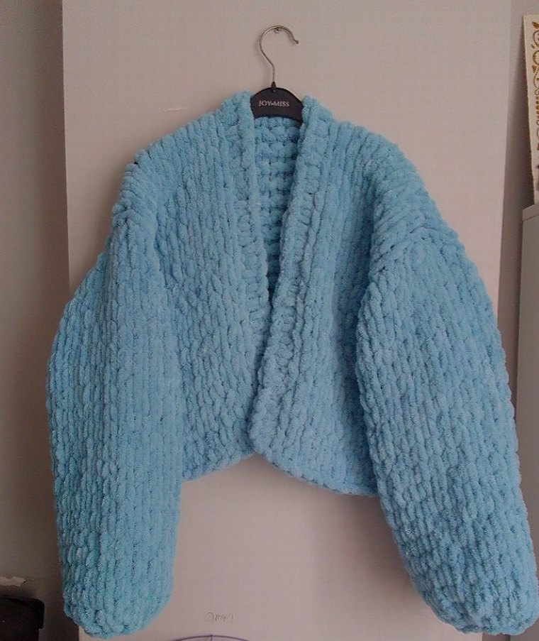 Pastel mavi renkte, uzun kollu, bol kesim örgü kadın hırka. Düz ve rahat stil, yuvarlak yaka ile günlük kullanıma uygun.