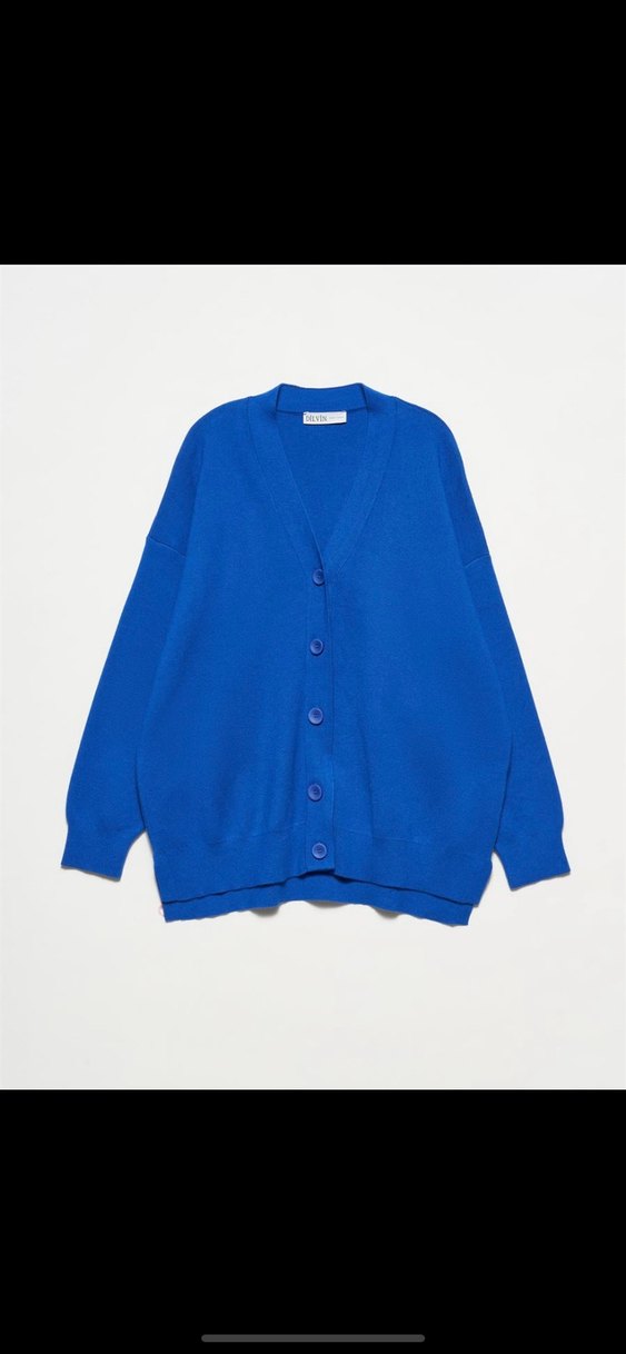 Yumuşak yünden, uzun kollu, mavi renkli, gevşek kesim örgü hırka. Günlük kullanım için rahat ve sade tasarım.