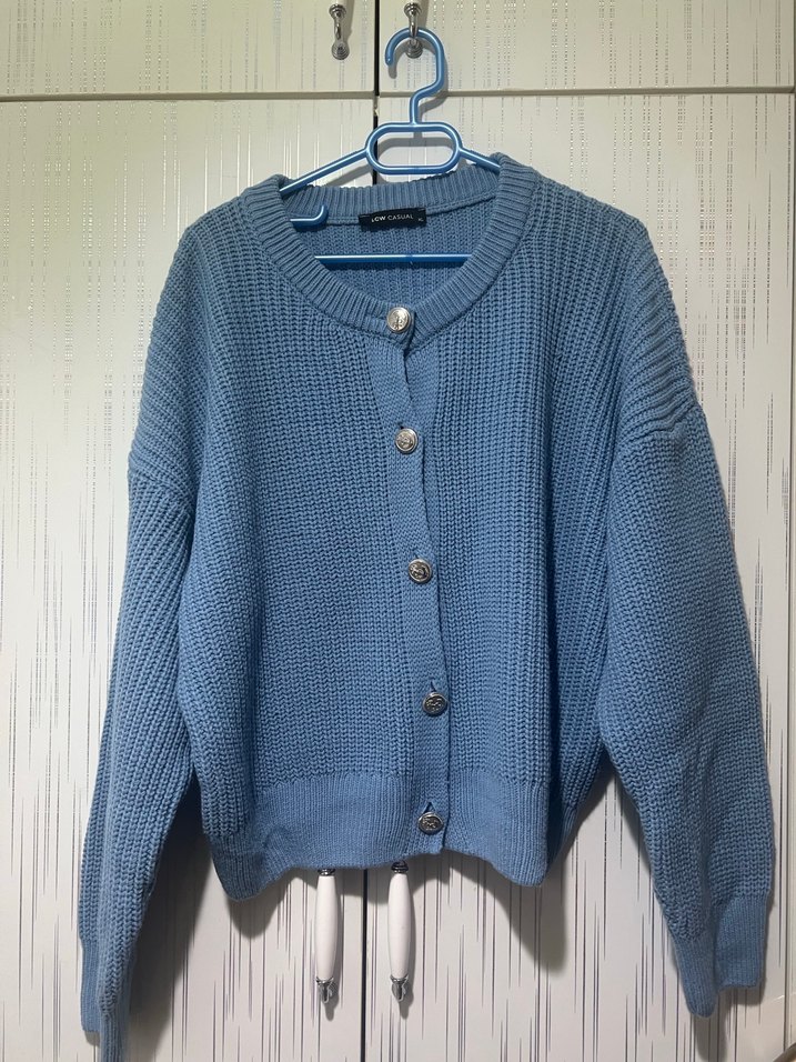 Pastel mavi renkli, örgü kumaştan yapılmış, yuvarlak yaka ve uzun kollu, rahat kesim ve normal boyda kadın hırkası. Günlük kullanıma uygundur. Sadece 2 kez çok kısa giyildi.