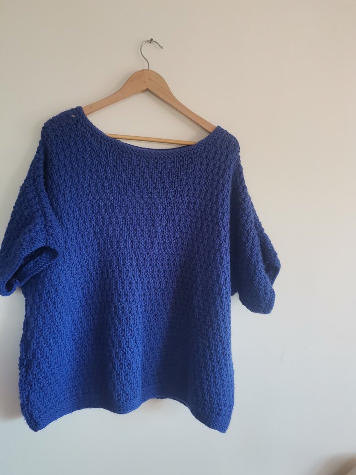 Parlak mavi örgü kadın kazak, yuvarlak yaka ve kısa kollu, rahat kesimle günlük kullanıma uygun sade ve konforlu bir tasarıma sahiptir.