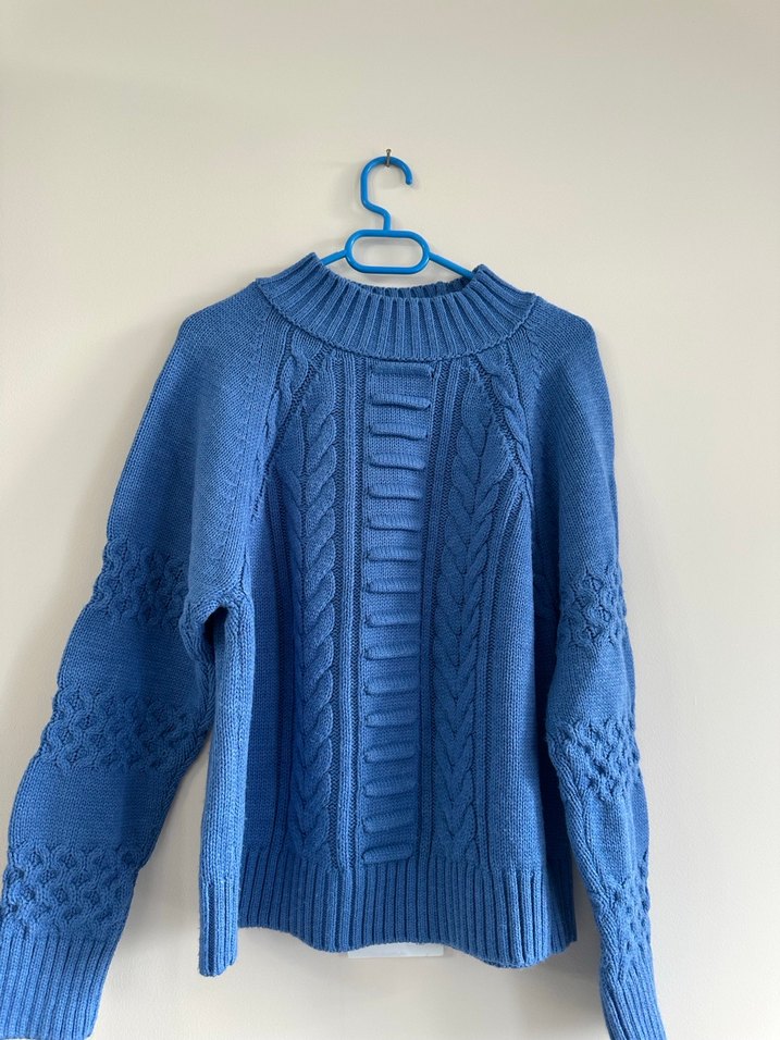 Mavi örgü kumaştan, yuvarlak yaka ve uzun kollu, bol kesim rahat bir kadın kazak. Günlük kullanım için uygundur.