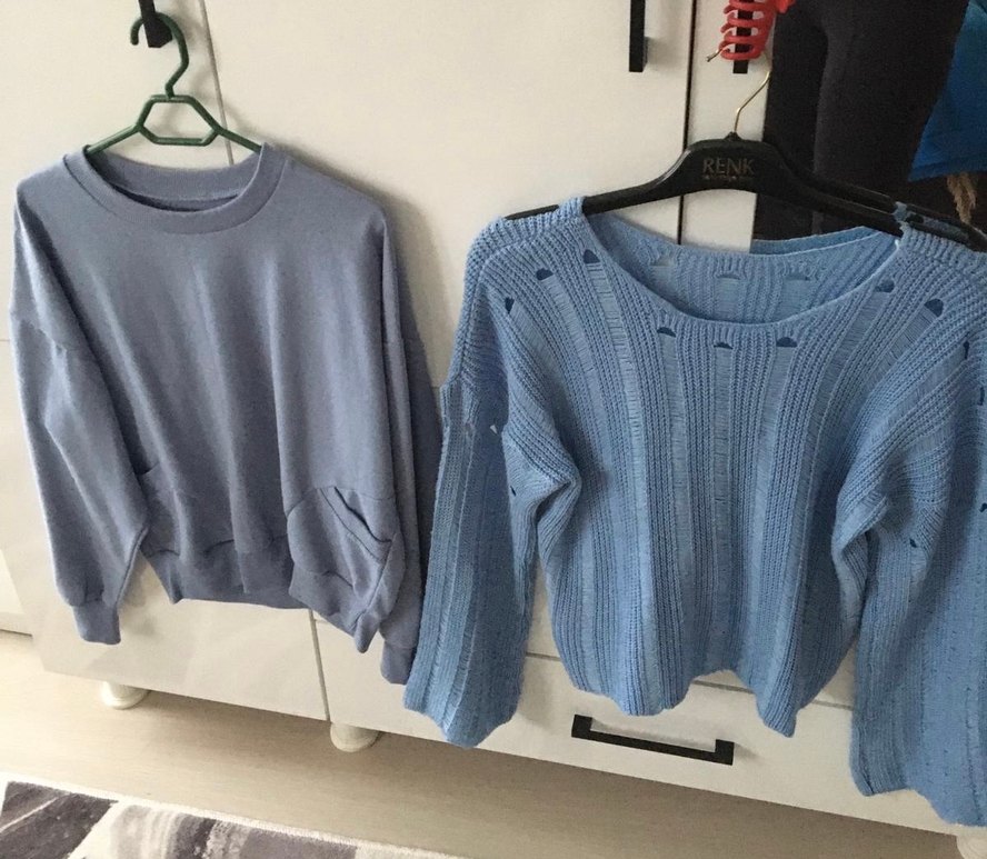 Mavi-gri tonlarda, örgüden yapılmış salaş kesim, uzun kollu ve yuvarlak yakalı kadın kazak. Günlük kullanıma uygun rahat bir parça. Ayrı ayrı satılır.