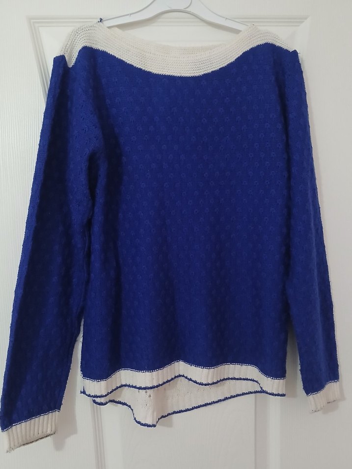 Kadınlar için parlak mavi renkli, uzun kollu ve yuvarlak yakalı örgü kazak. Salaş kesimi ve normal boyuyla bohem-retro tarzını yansıtır, rahat günlük kullanım için uygundur. Yaka ve etek kısmında beyaz detaylar bulunur.