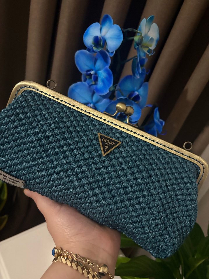 Mavi örgü dokusuyla ve metal çerçeveli kapamayla rahat ve bohem tarz sunan Guess logolu kadın portföy çanta. Koyu mavi ve yılan deseni dokunuşlu.
