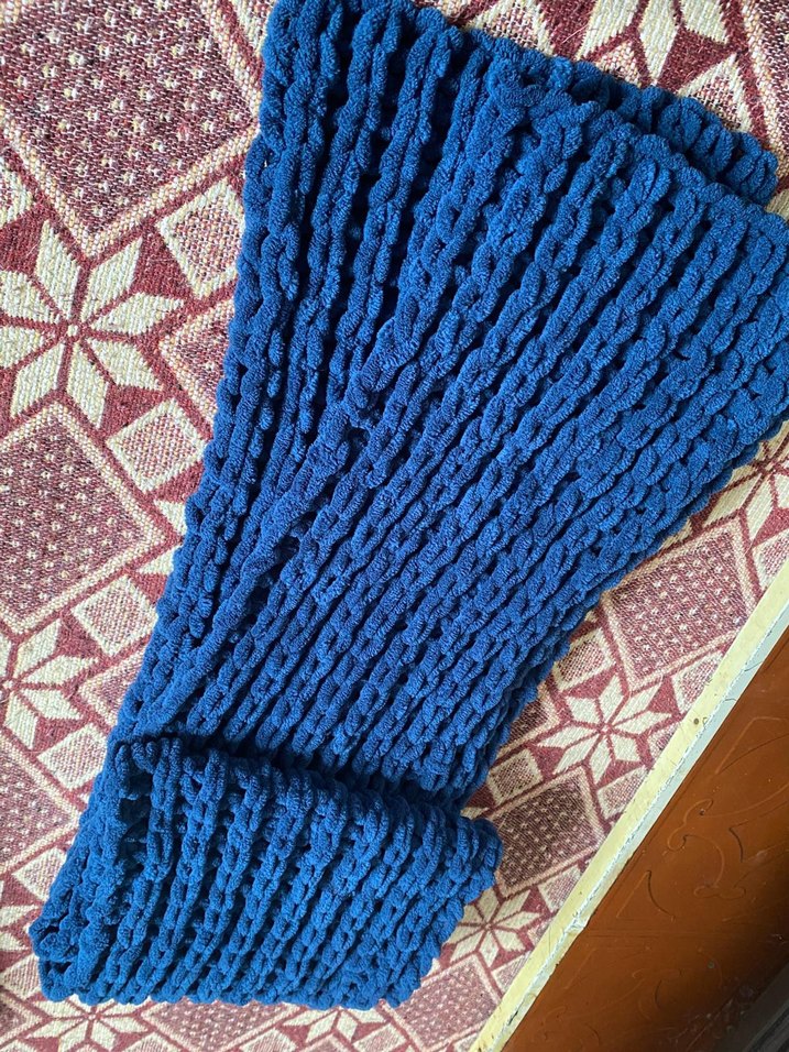 Mavi renkli, örgü dokulu bu kadın şalı, bohem tarzı ve rahat yapısıyla renkli ve retro bir görünüm sunar.