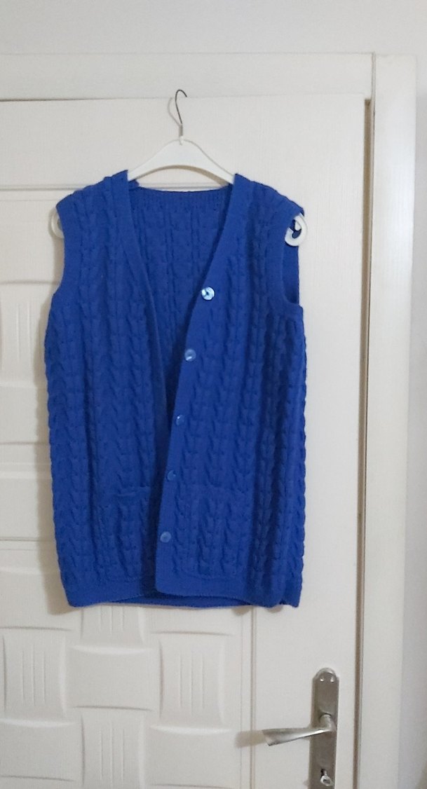 Mavi renkli, örgü kadın süveter, gevşek kesim ve kesik yaka özelliğine sahiptir. Kolsuz ve normal midi boydadır, günlük kullanıma uygundur. Rahat ve desensiz, renkli bir stildir.