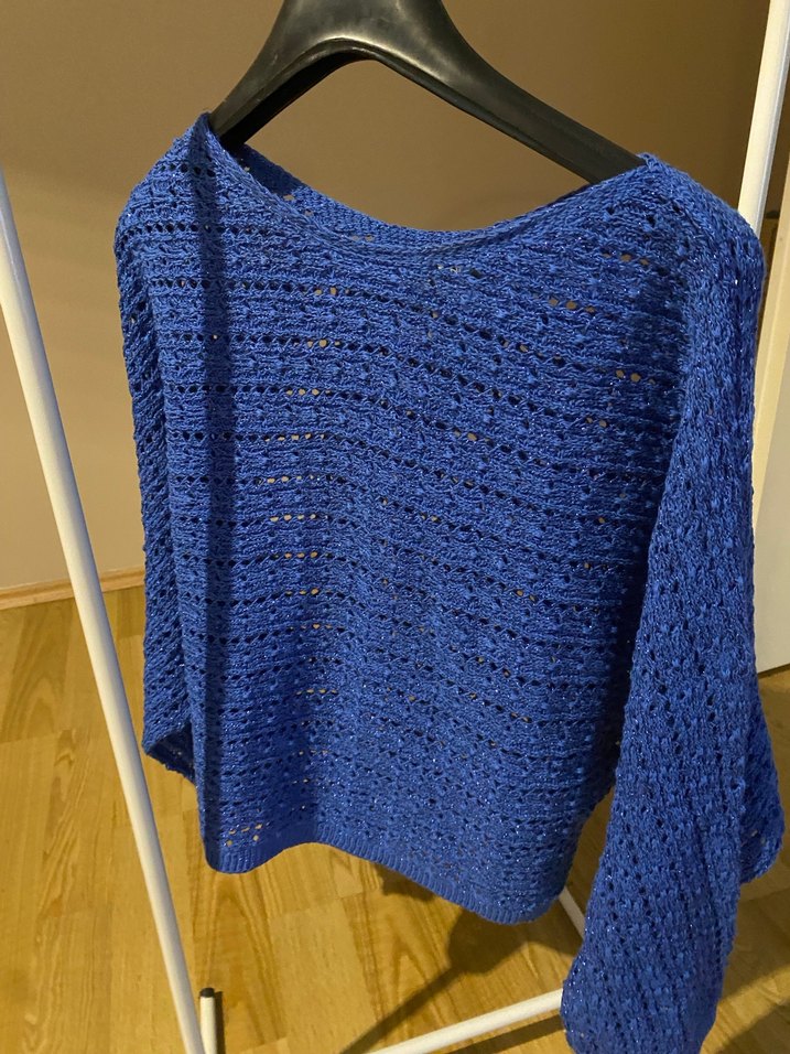 Uzun kollu, salaş kesim ve kayık yaka mavi örgü kadın triko. Parlak renkte, sade ve rahat tasarıma sahip.