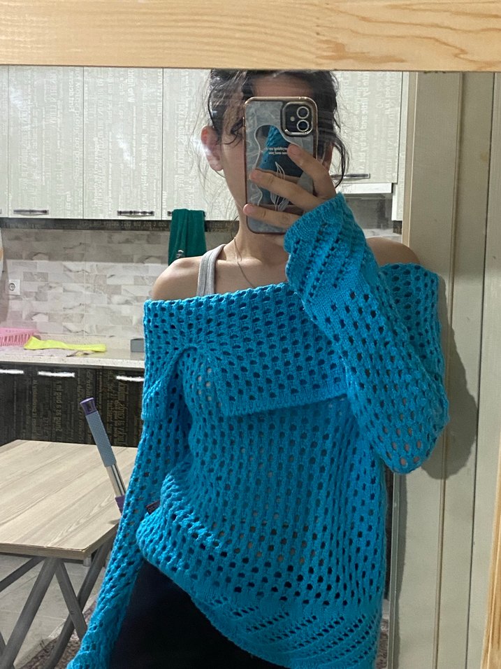 Mavi renkli, uzun kollu ve kayık yakalı örgü kadın kazak. Rahat kesimi ve midi boyu ile konforlu sokak stiline uygun.