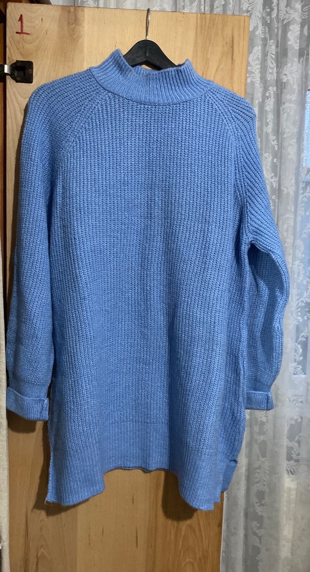 Yumuşak örgü kumaştan, bol kesim, uzun kollu ve yüksek yakalı mavi triko kazak. Günlük kullanıma uygun rahat tasarım.