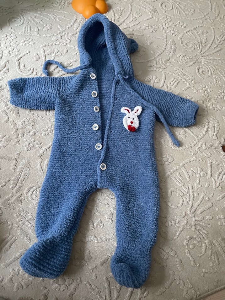 Kapüşonlu ve düğmeli mavi örme bebek tulumu, sevimli tavşan detaylı. Yumuşak ve sıcak kumaştan üretilmiştir.