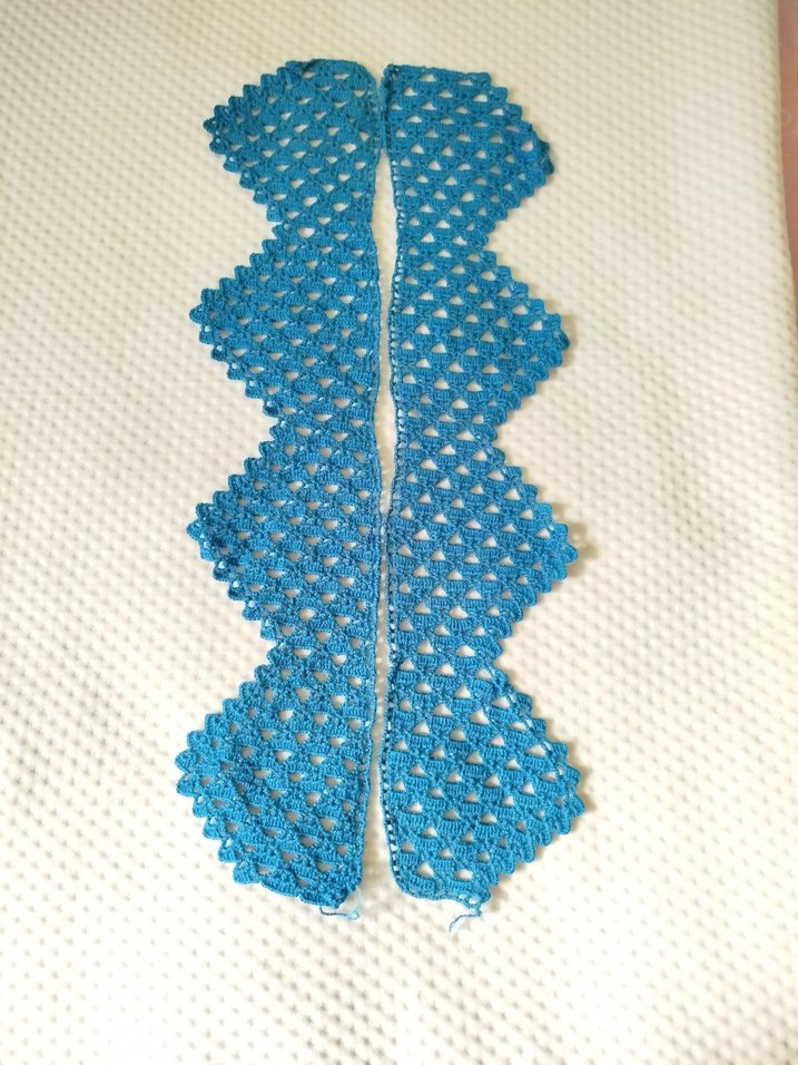 Mavi renkli, dantel detaylı örme kenar ucu. İnce örgü ipiyle örülmüş.