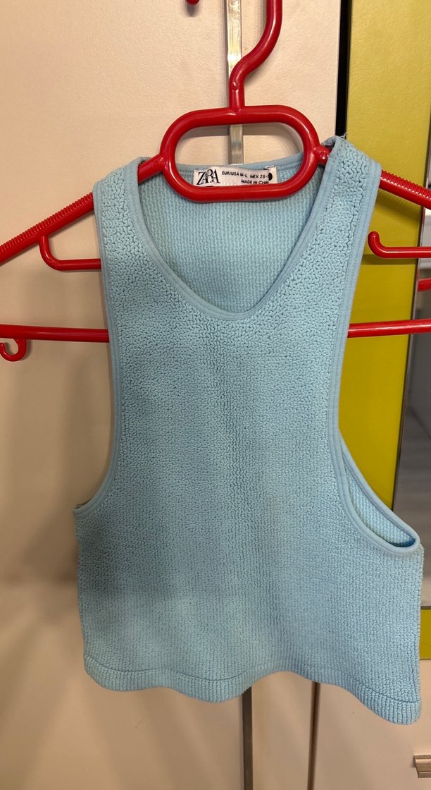 Dar kesim, kolsuz ve yüksek yakalı bu atlet, yumuşak sentetik kumaştan örülmüştür. Pastel mavi rengi ve örgü dokusu sokak stili ve athleisure için uygundur. ♀️
