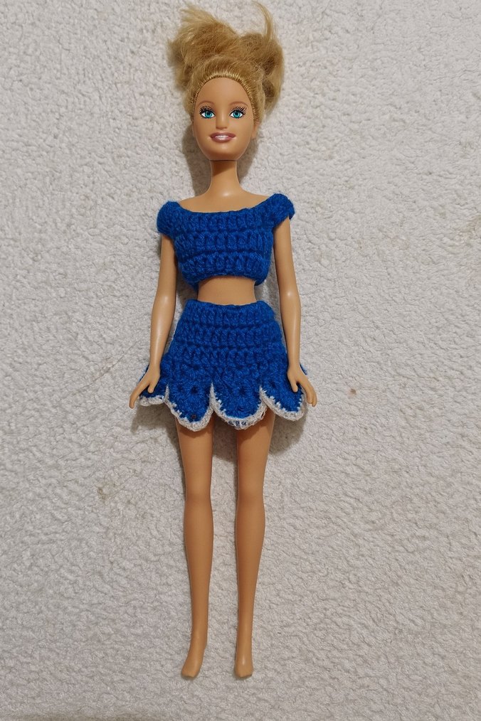 Canlı mavi renkli, beyaz detaylı örgü üst ve etek giymiş bebek. El yapımı ve renkli kıyafet.