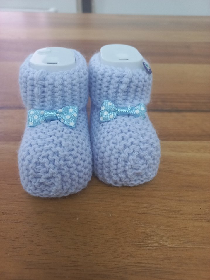 Mavi renkli, örgü kız bebek patikleri küçük fiyonk detaylarıyla rahat ve sıcak tutar.