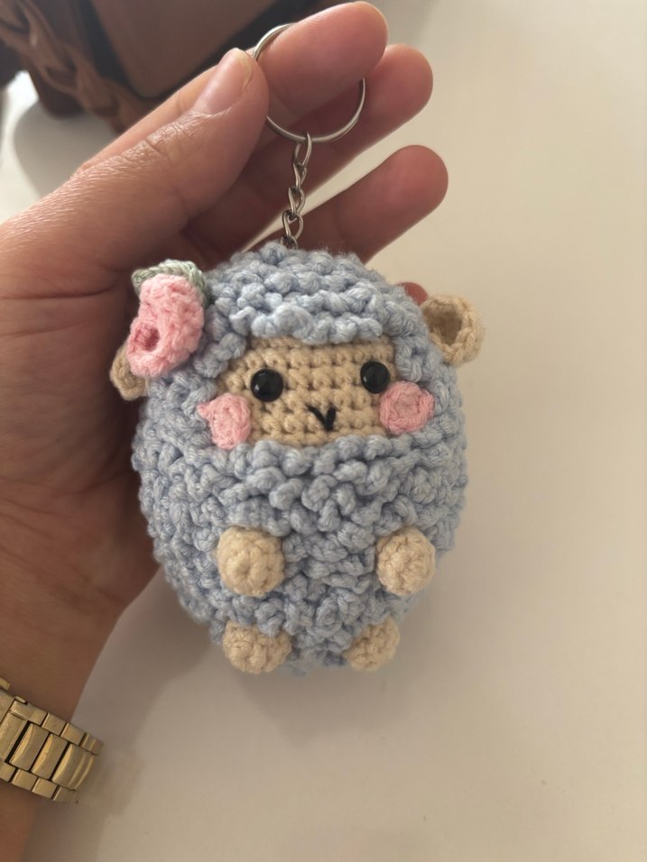 Pembe yanaklı ve çiçek detaylı, örgüden yapılmış mavi kuzu şeklinde rahat bir anahtarlık, bohem tarz sevenler için uygundur.