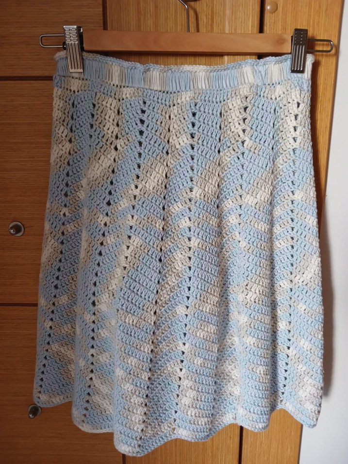 Bu bol kesim hamile eteği, pastel mavi ve beyaz renklerde örgü dokusuyla bohem ve rahat bir tarz sunar.