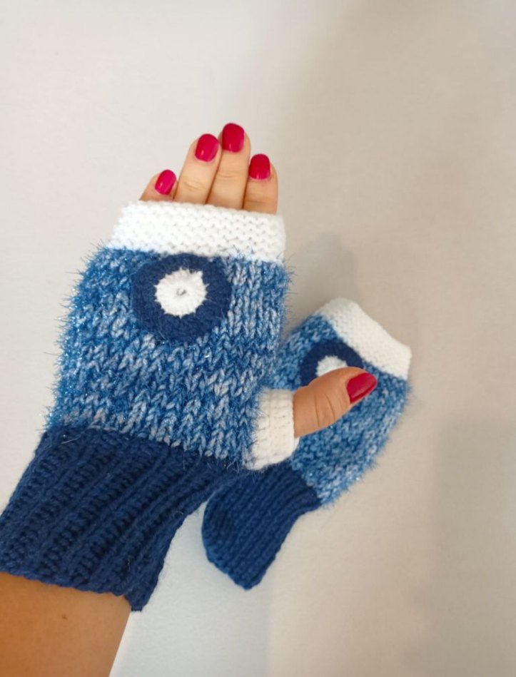 Mavi örgü, parmaksız kadın eldivenleri, renkli desenleriyle bohem ve retro tarz için rahat bir tasarıma sahiptir.