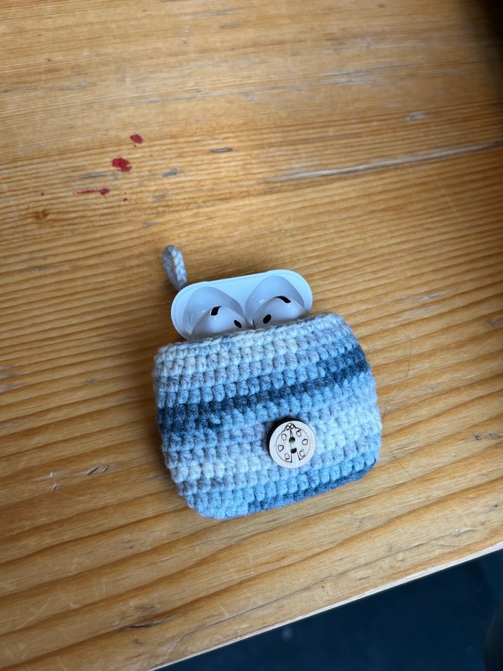 Mavi renkli, düğmeli örgü telefon kulaklık kılıfı. Kablosuz kulaklıkları korumak ve taşımak için uygun. El yapımı kumaş ile özel tasarım.