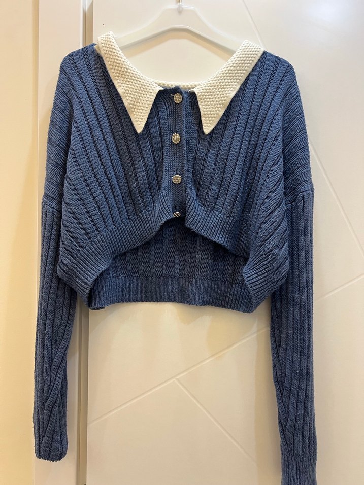 Mavi renkli, örgü kumaştan yapılmış, yakalı ve uzun kollu, bol kesim kadın kazak. Düğmeli ön kısmı ve normal midi boyu ile rahat bir günlük tercih sağlar.