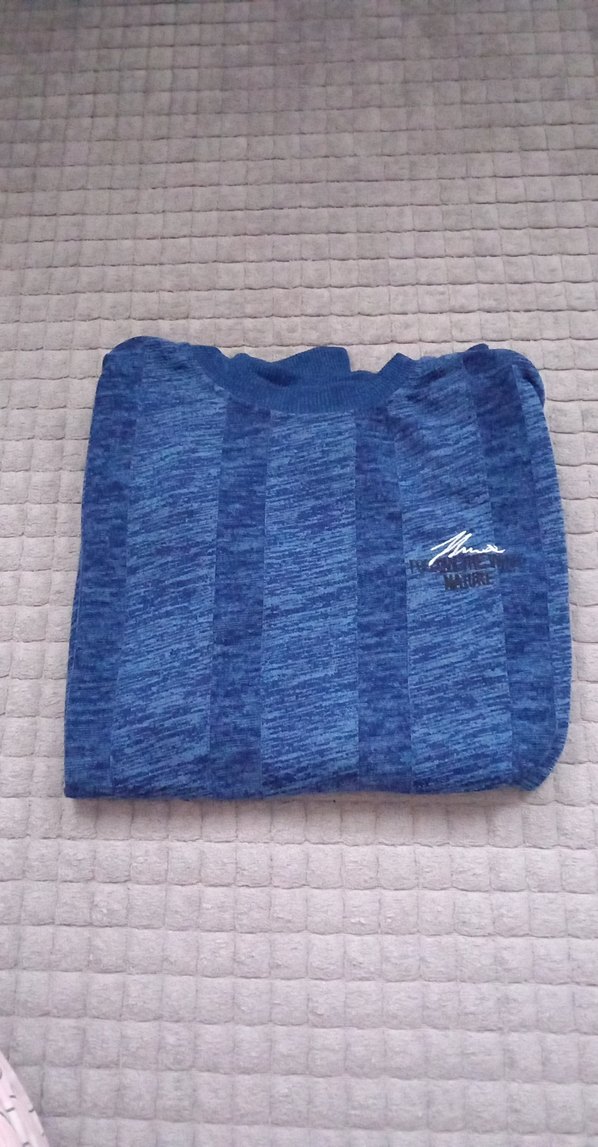 Mavi örgüli sweatshirt, uzun kollu ve yuvarlak yaka, bol kesim ve yumuşak, sıcak kumaş. Spor ve gündelik sokak giyimine uygun. sorunsuz