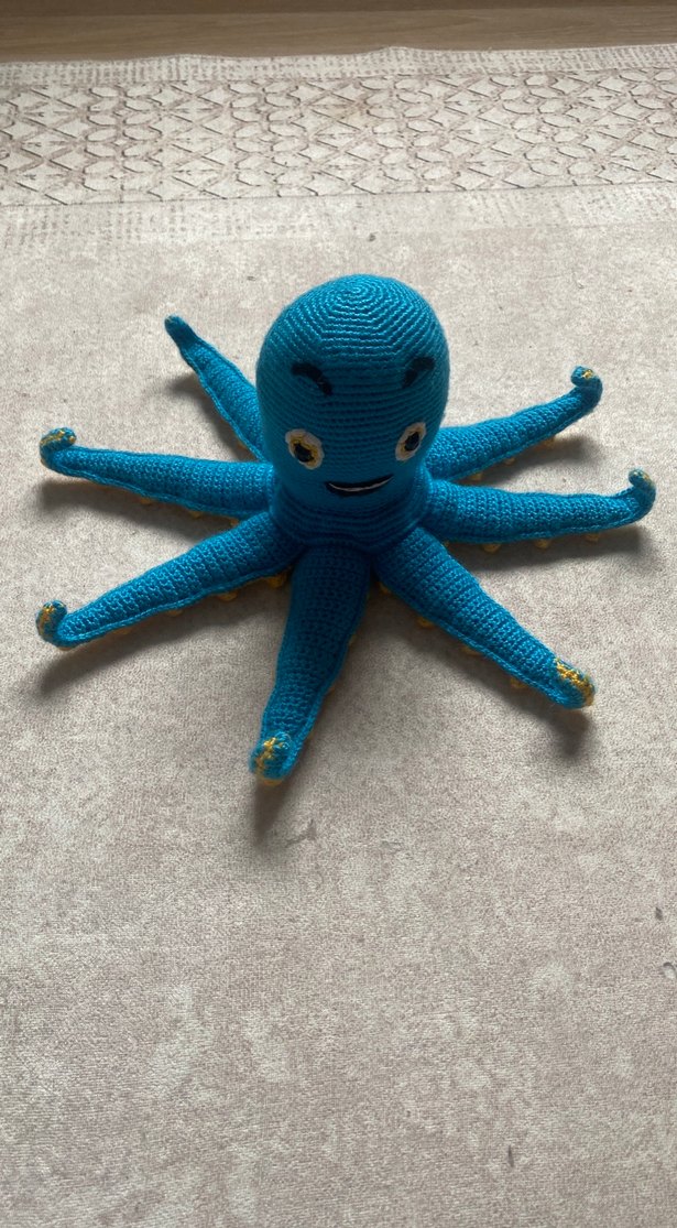 Detaylı gözleri ve gülümsemesi olan yumuşak, renkli mavi örme ahtapot peluş oyuncak. Sarılmak ve dekorasyon için ideal.