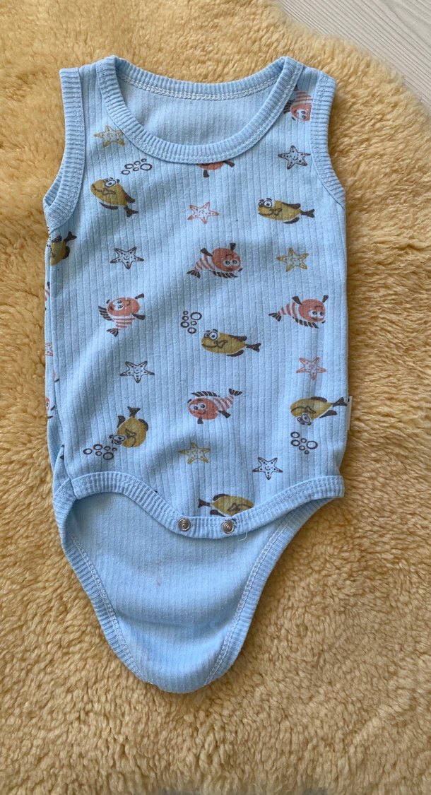 Mavi pastel tonlarında, balık ve yıldız desenli örme, kolsuz, boğazlı bebek erkek body. Yumuşak ve rahat kumaştan üretilmiştir.