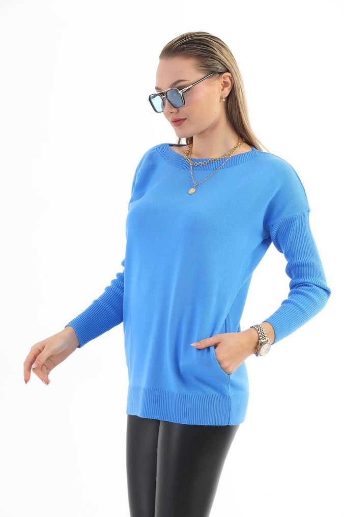 Bu açık mavi örme sweatshirt, yuvarlak yaka ve uzun kollu, bol ve kısa kesimlidir. Düz tasarımı günlük kullanıma uygundur.