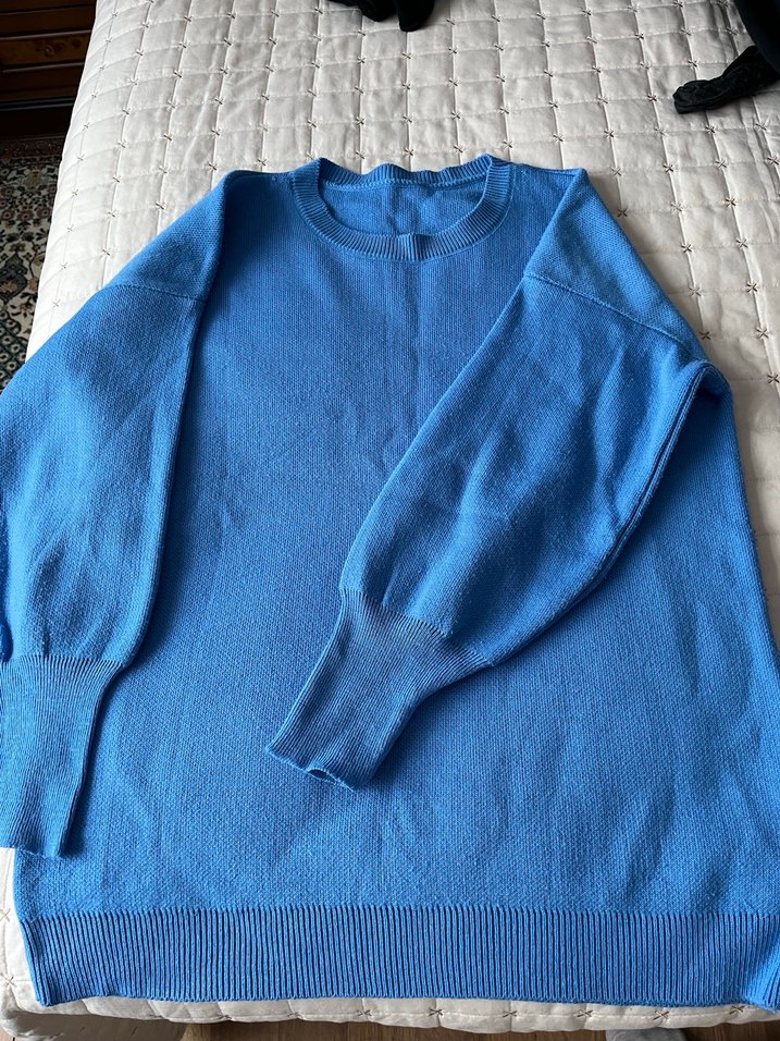 Mavi renkli, yuvarlak yaka ve uzun kollu, örme kadın sweatshirtü. Rahat ve bol kesimiyle yumuşak, sıcak kumaştan üretilmiştir.