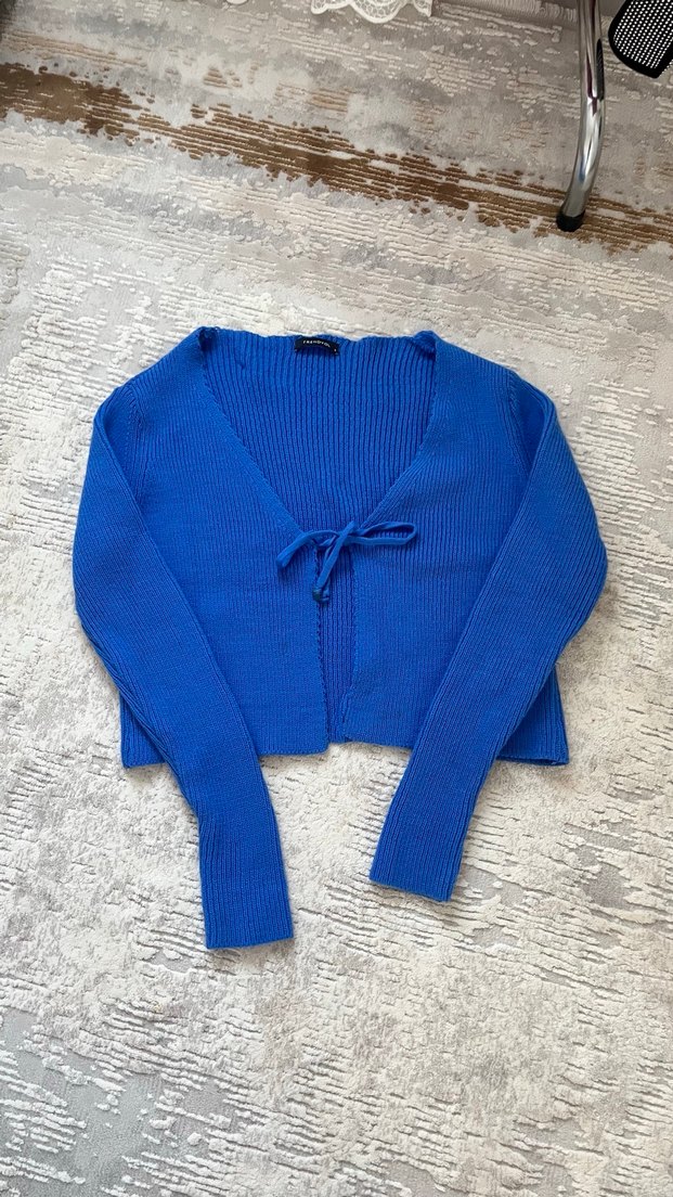 Mavi örme, uzun kollu, bisiklet yaka ve kısa boyda, önünde bağcık detayı bulunan, rahat ve şık kadın hırkası.