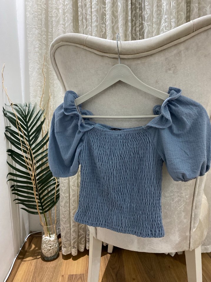 Mavi renkli,kare yakalı ve örme dokulu kısa kesim bluz. günlük kullanıma uygun şık bir model.