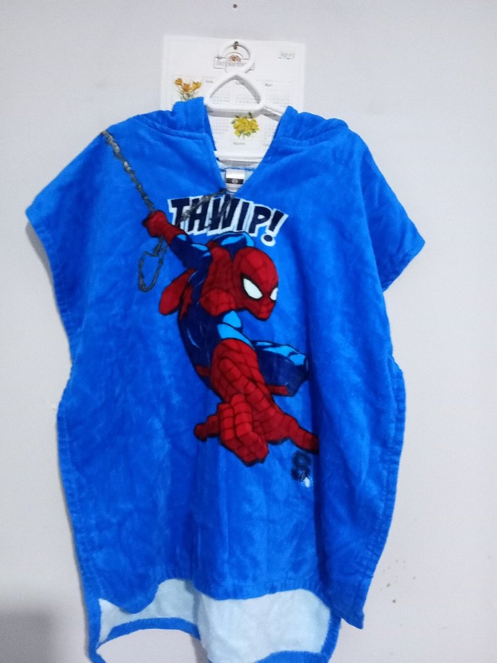 Renkli mavi çocuk bornozu, baskılı Örümcek Adam deseni içerir. Yumuşak kumaştan üretilmiş olup, banyo sonrası rahatlık ve sıcaklık sağlar. 110.128 beden.