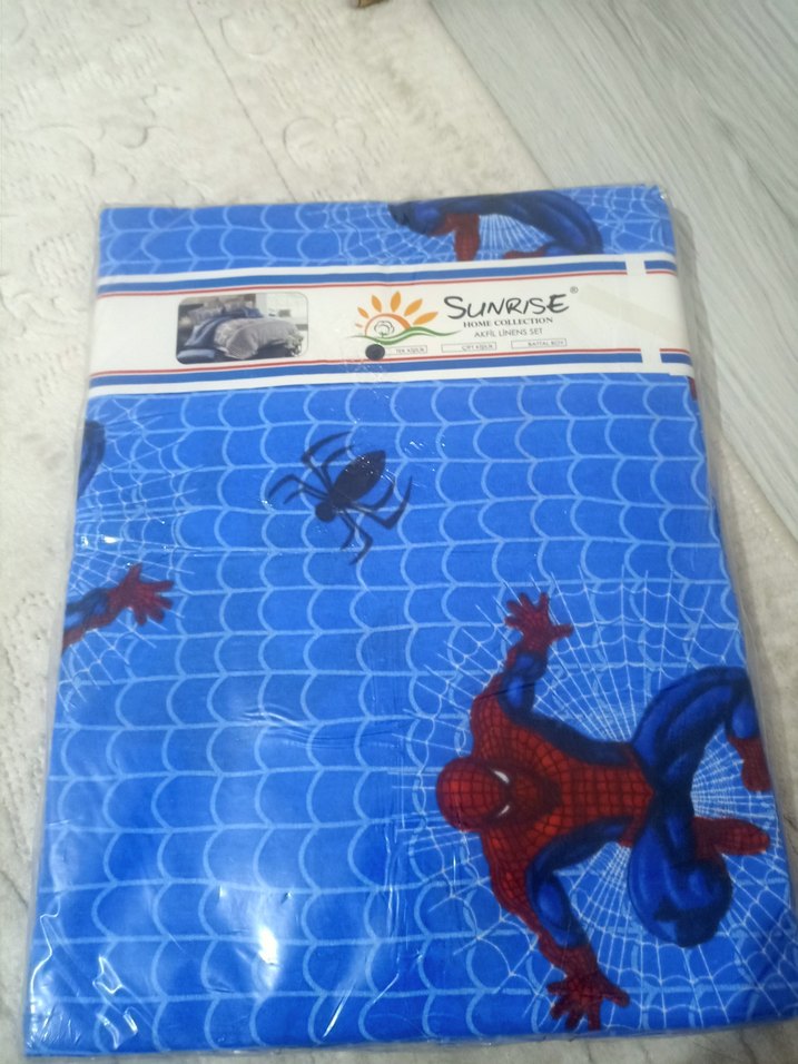 Mavi zemin üzerinde örümcek ağı desenli, renkli Örümcek Adam baskılı nevresim takımı. ️