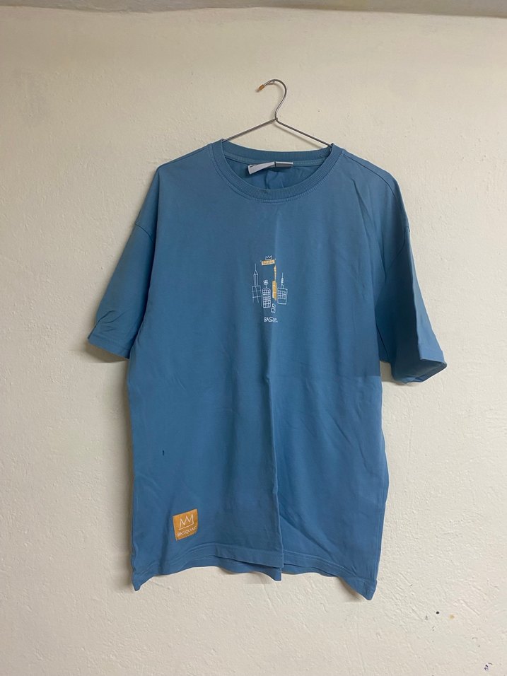 önde çok küçük bi yırtık mevcut Mavi pastel tonlarında, kısa kollu, bisiklet yaka ve bol kesim denim erkek tişörtü. Ön kısmında küçük baskı detayı ile rahat ve şık sokak stili tişört.