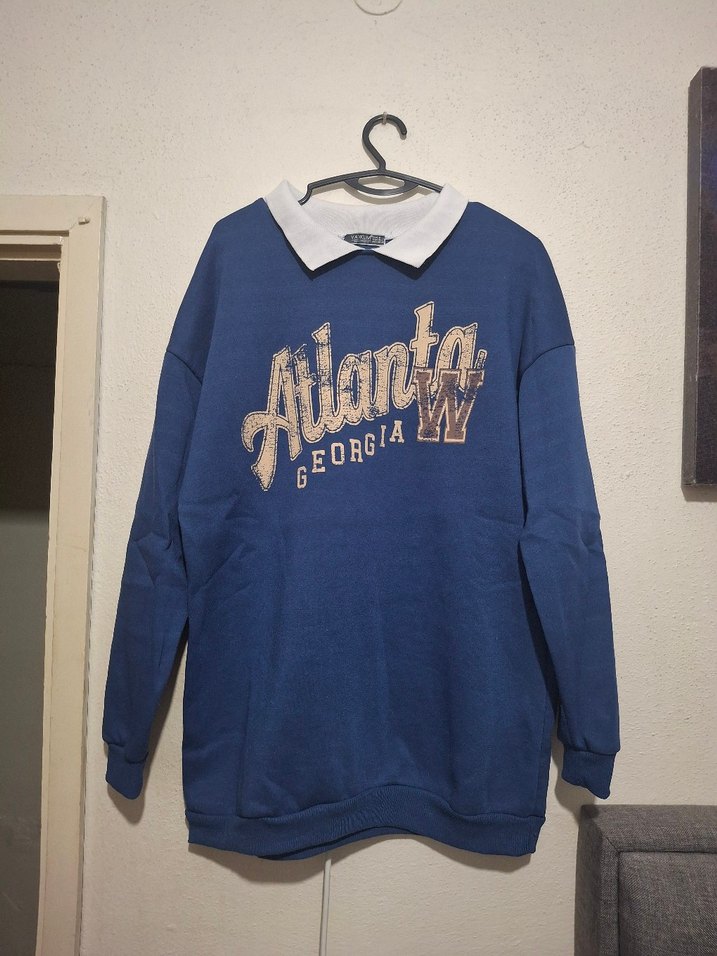 Mavi 3 iplik şardonlu kumaştan, yakalı ve uzun kollu, bol kesim bir sweatshirt. Örgü dokusu ve parlak "Atlanta GEORGIA" baskısı bulunur. Günlük ve sokak tarzı için uygundur.