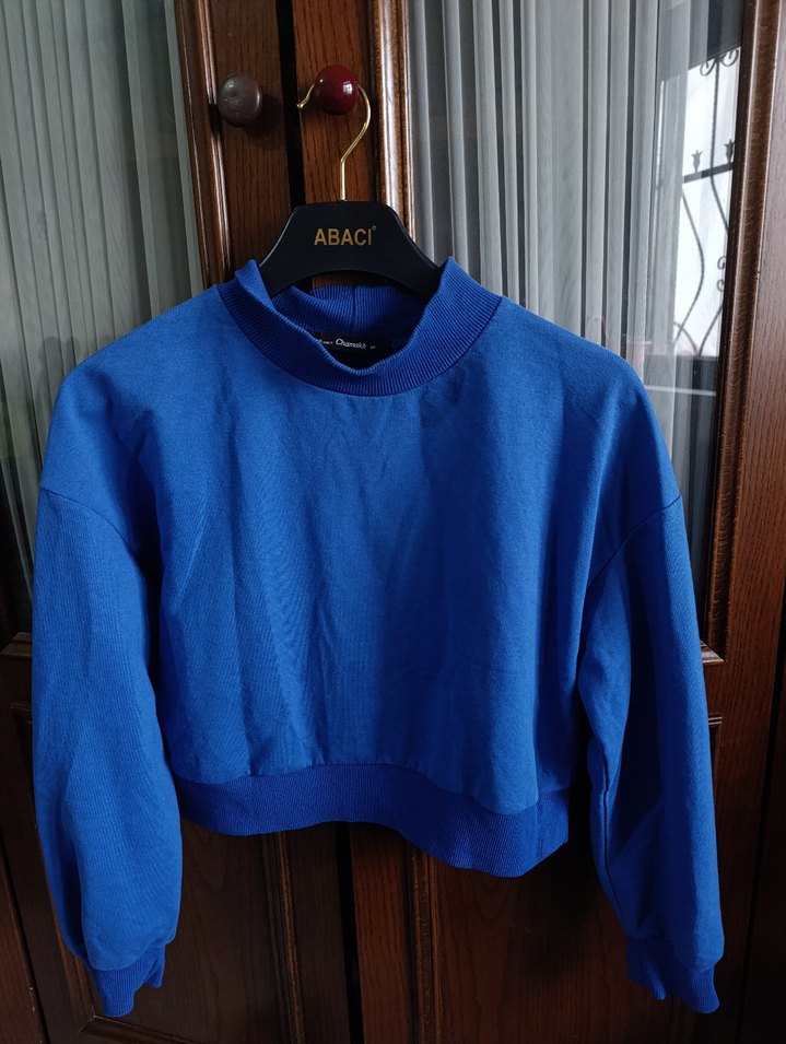 Bu koyu mavi sweatshirt, bir iki ker giyildi yeni gibi, crop tarzıdır.