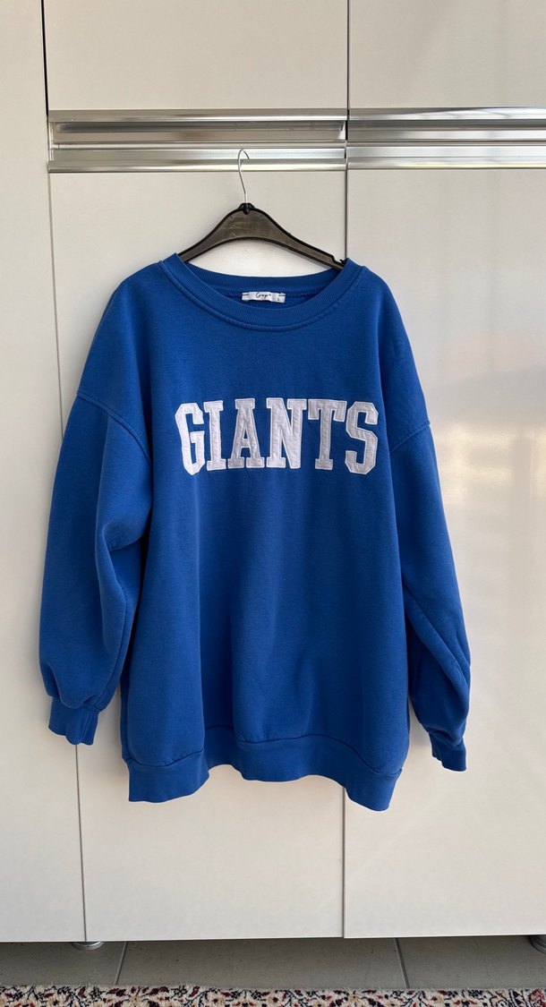 Mavi renkli, oversize kesim kadın sweatshirtü, uzun kollu ve bisiklet yaka. Önünde "GIANTS" baskısı bulunan, yumuşak ve sıcak dokulu örme kumaştan üretilmiştir.