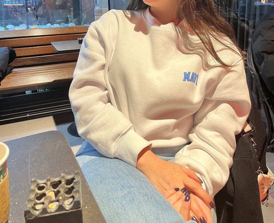 Beyaz, bisiklet yaka, uzun kollu, bol kesim sweatshirt. Denim görünümlü kumaş ve pastel baskı ile günlük rahat stil sunar.